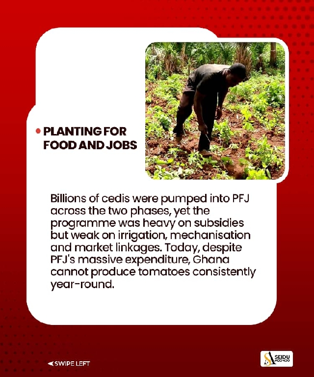 Billions of cedis were also pumped into PFJ across the two phases, yet the structure of the programme, which was heavy on subsidies but weak on irrigation, mechanisation and market linkages, meant that the country remains vulnerable to seasonal shortages.