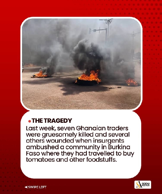 Last week, seven Ghanaian traders were gruesomely killed, and several others were wounded when insurgents ambushed a community in Burkina Faso where they had travelled to buy tomatoes and other foodstuffs.