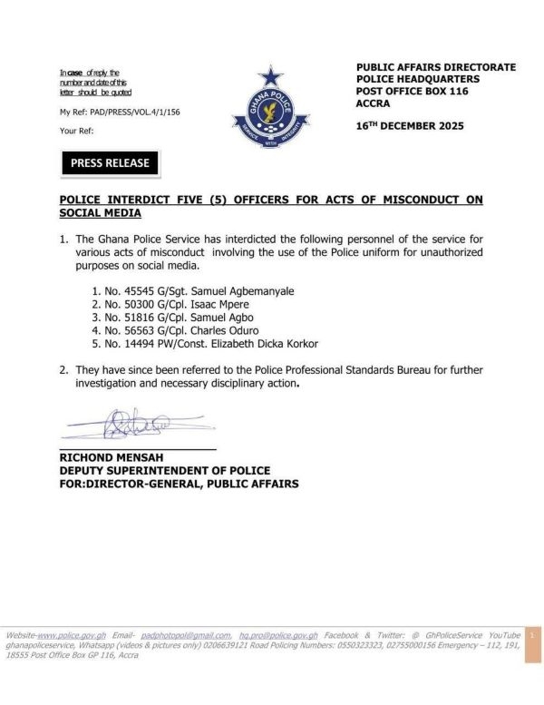 The Ghana Police Service has interdicted five police officers over alleged professional misconduct involving the unauthorised use of police uniforms on social media platforms.