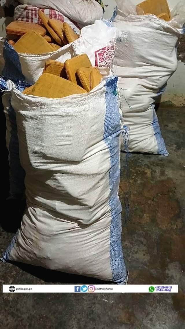 Police said preliminary investigations revealed that a snap check team intercepted a KIA Bongo truck driven by Yaw Ntoso, and upon a thorough search conducted by officers three white sacks containing 135 compressed slabs of dried leaves suspected to be cannabis sativa, a narcotic drug, wrapped in yellowish cellotapes and 21 oval-shaped parcels of similar substances were discovered.