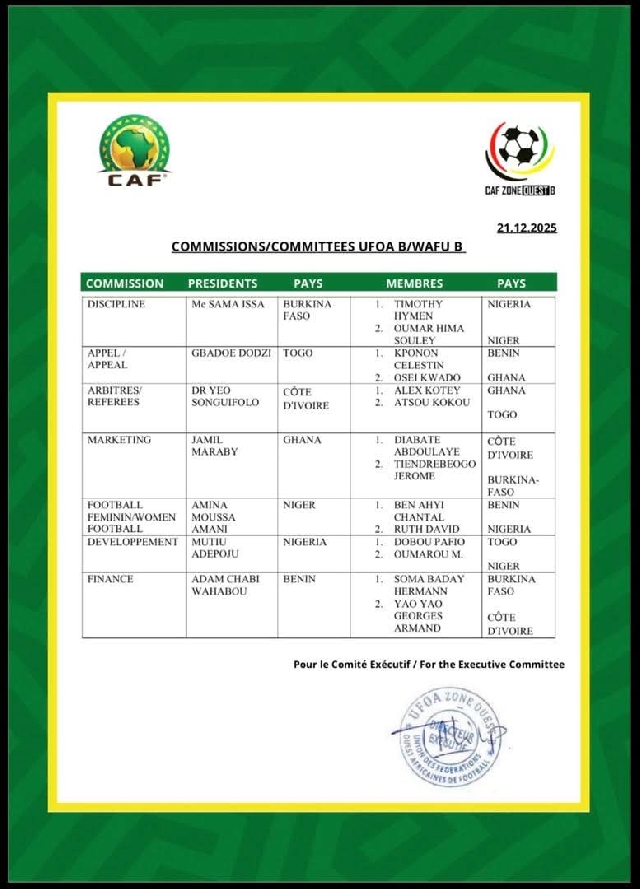 The West African Football Union (WAFU) Zone B has appointed three Ghanaians, Jamil Maraby, Alex Kotey and Osei Kwadwo Adow, to its newly constituted committees, marking a significant milestone in the sub-regional body’s governance and administrative evolution.