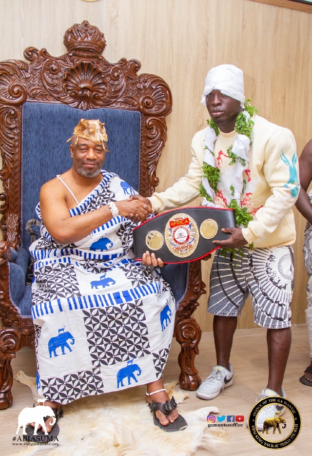 Newly crowned WBA Africa Light Heavyweight Champion, Jonathan Tetteh, popularly known as “Worldwide,” paid a courtesy visit to King Tackie Teiko Tsuru II, the Ga Mantse, on Monday to formally present his championship belt.