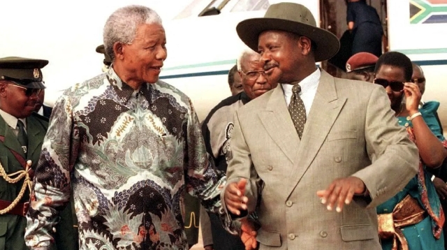 | AFP via Getty Images (Pic): Museveni, wearing his trademark hat, with Nelson Mandela in 1998