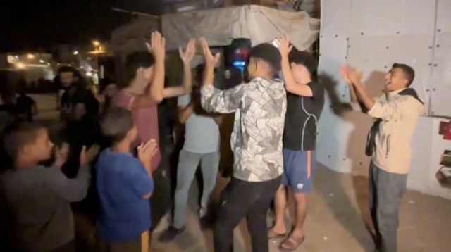 | Reuters (Pic): Palestinians celebrate in the streets of Khan Younis