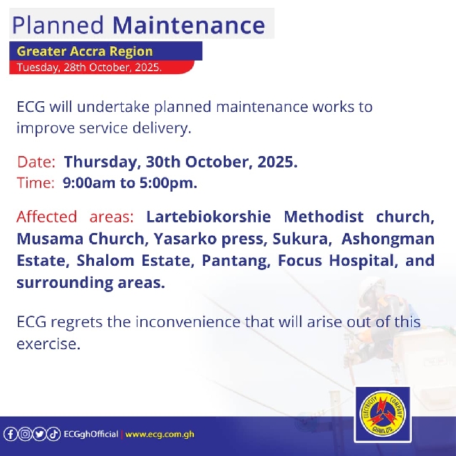 The Electricity Company of Ghana (ECG) has announced planned maintenance works in parts of the Greater Accra Region scheduled for Thursday, October 30, 2025.