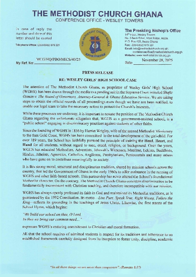 The Proprietor of Wesley Girls' High School (WGHS), the Methodist Church of Ghana, has reacted to the ongoing debate over the school's alleged discrimination of students of divergent faiths, particularly muslims, insisting this was inconsistent with the church and school's traditions.