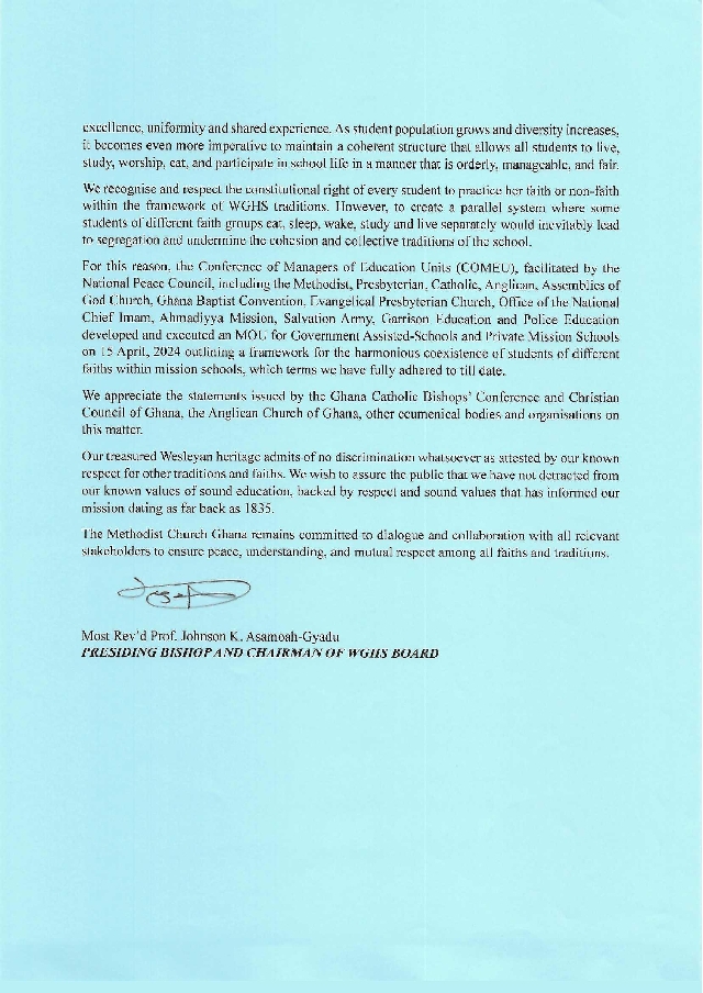 "For this reason, the Conference of Managers of Education Units (COMEU), facilitated by the National Peace Council, including the Methodist, Presbyterian, Catholic, Anglican, Assemblies of God Church, Ghana Baptist Convention, Evangelical Presbyterian Church, Office of the National Chief Imam, Ahmadiyya Mission, Salvation Army, Garrison Education and Police Education developed and executed an MOU for Government Assisted-Schools and Private Mission Schools on 15 April 2024, outlining a framework for the harmonious coexistence of students of differen faiths within mission schools, which terms we have fully adhered to till date," the church said.